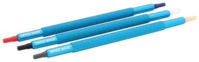 Due to their plastic ends, these tools are ideal to inset watch hands without scratching the dial. Two different hole diameters per tool, to ensure a perfect fit. Aluminium handle in blue anodised finish. Spare tips available